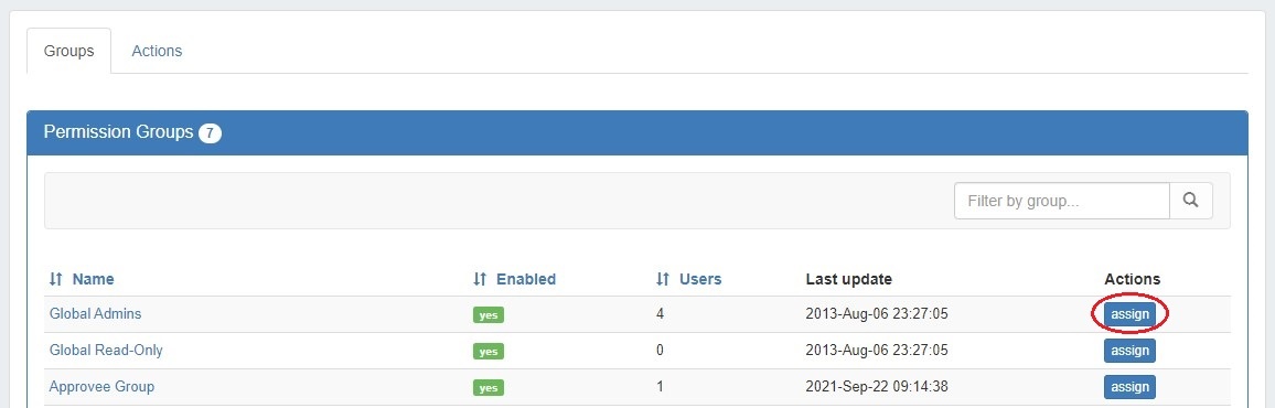 Then, under the Groups page tab, find the User Group you wish to want to assign a policy to and click "Assign".