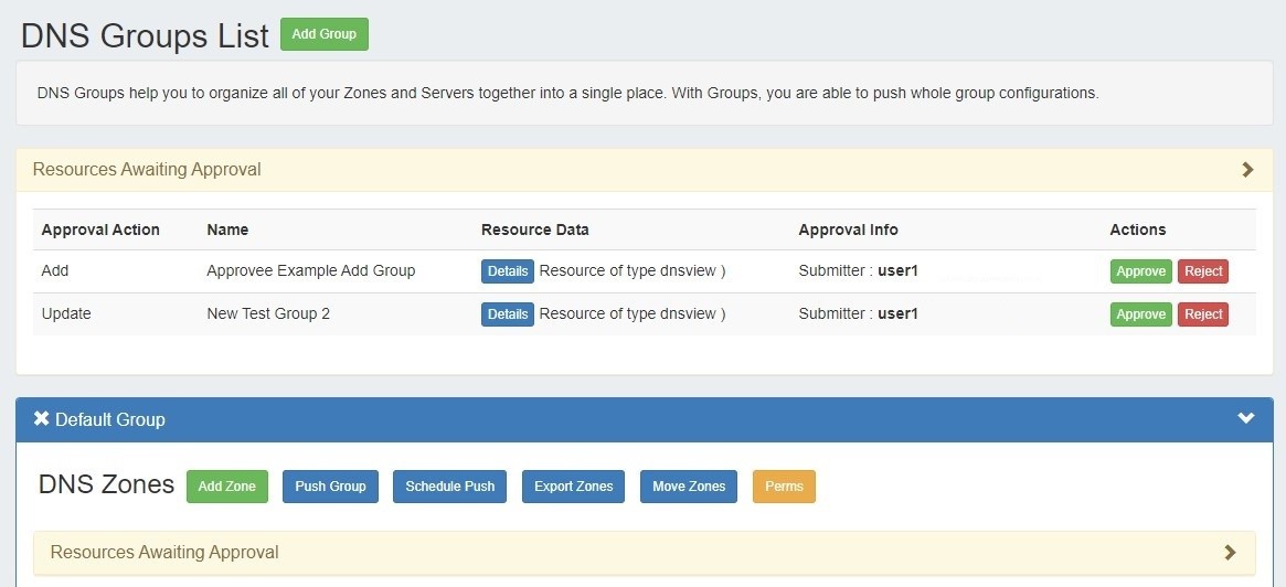 A "Resources Awaiting Approval" module will display in selected DNS / DHCP pages to Users with Admin / Approval permissions, if a change has been submitted on that page that is pending approval by the User's Approval Group.