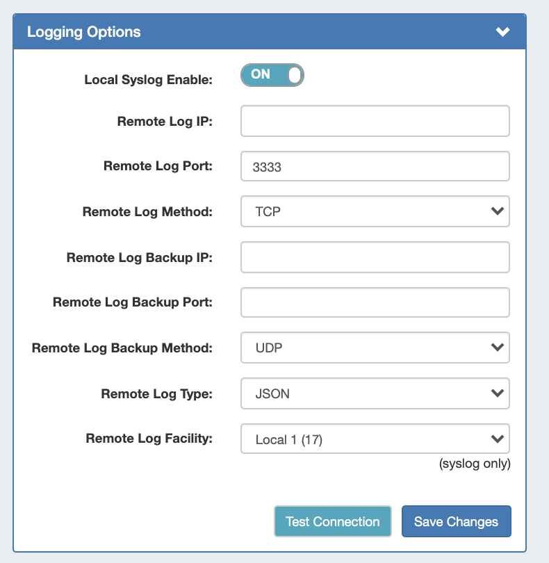 - Remote Log Backup IP: Target IP address for the Backup syslog server you will send log information to