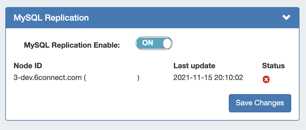 To enable / disable MySQL Replication, turn the toggle to the ON/OFF position, respectively. Click "Save Changes" when done.