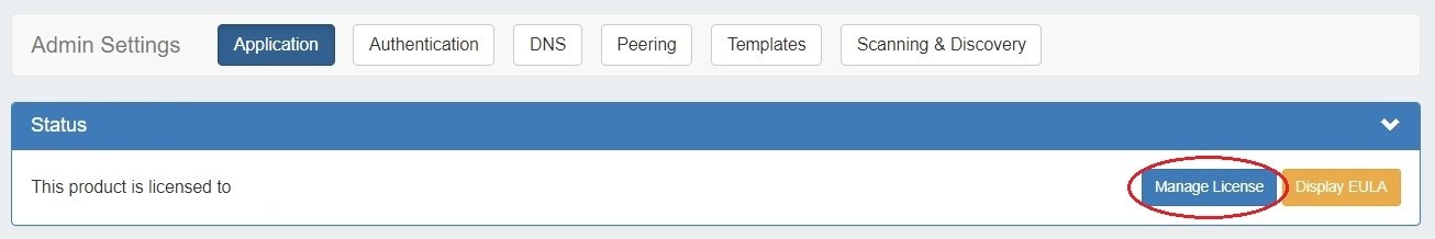 From the Admin Settings page, ensure the "Application" sub-tab is selected, then click "Manage License".