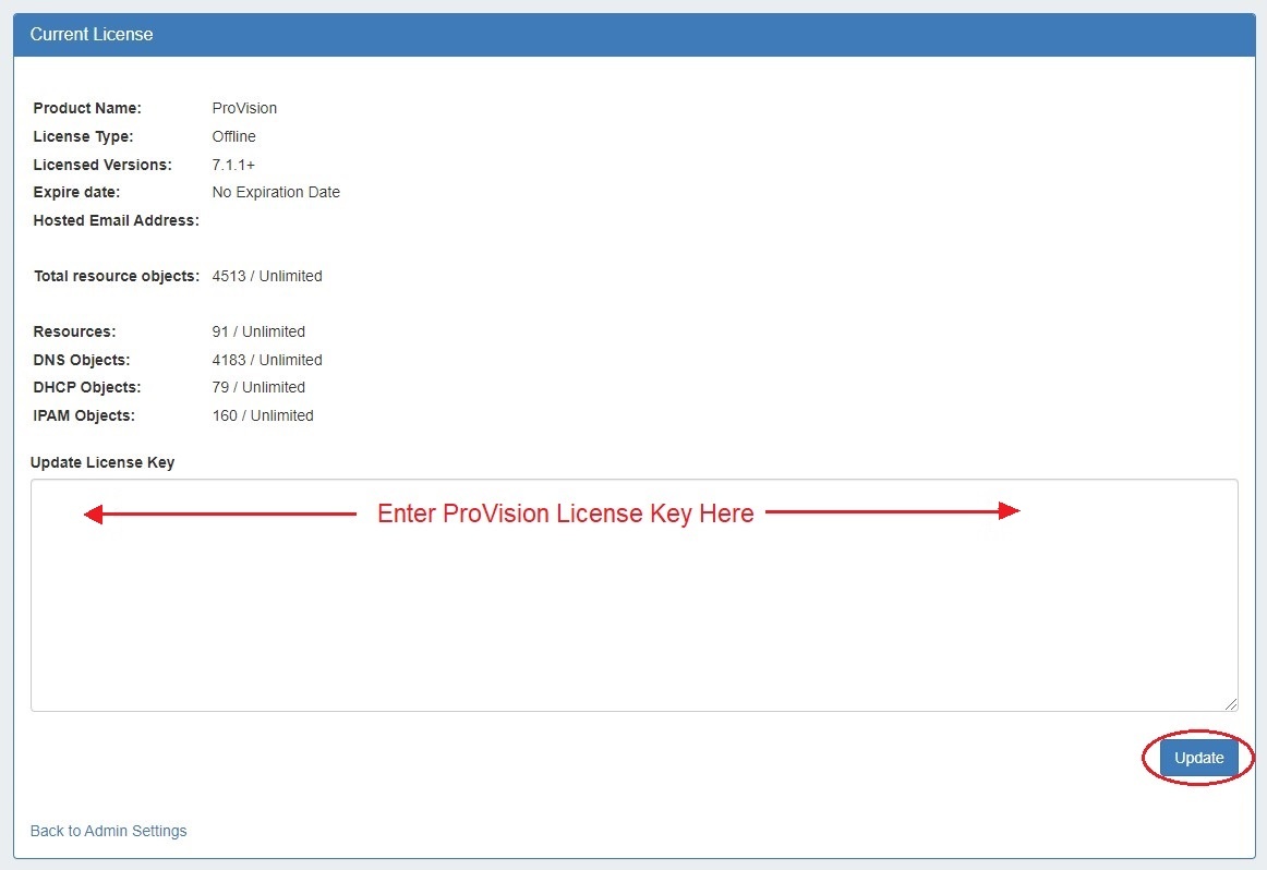 To add/update a License Key, paste the key provided into the "Update License Key" box, and click "Update License".