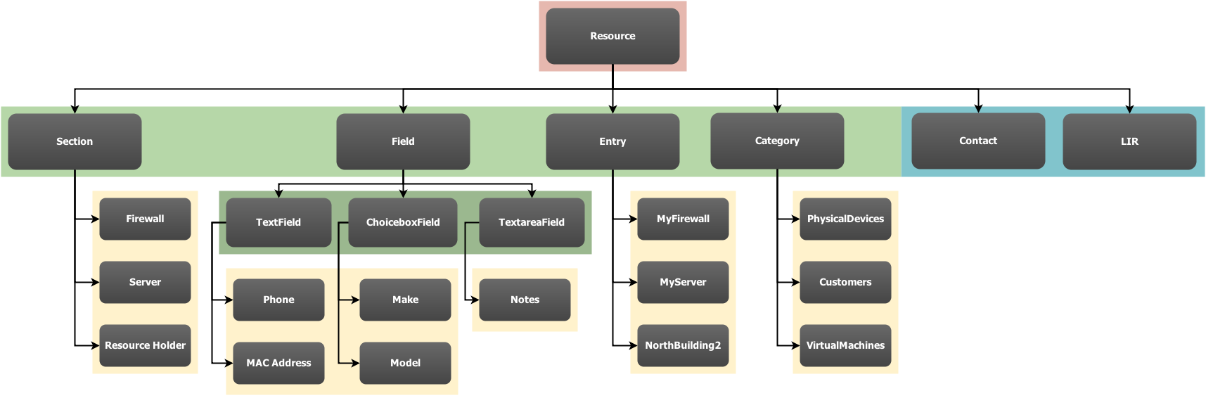 The asset system is a content management system (CMS) that is built as an extension to the resource system. It's the main use of the resource system, and to many, the terms "asset system" and "resource system" can seem synonymous. In the diagram below, the Resource class is at the top in red. The child-classes that make up the asset system are in green. Yellow is used for examples of objects (not classes) that could/would have been instantiated from their Class. And the items in blue are examples of resource child-classes (resource types) that exist outside of the asset system.