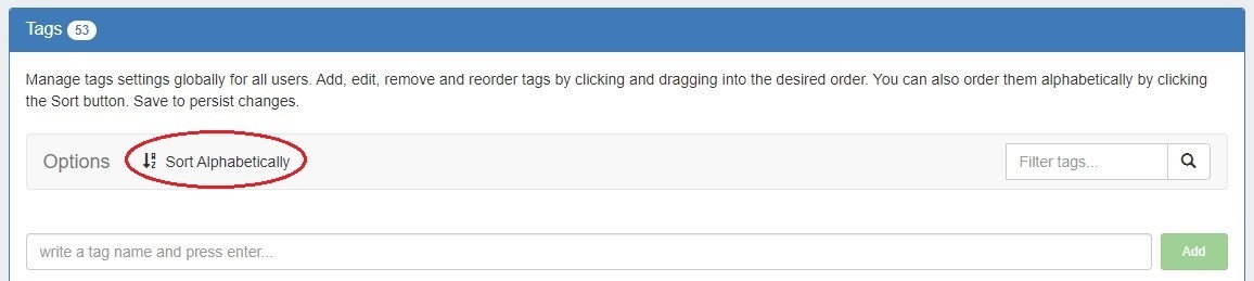To reorder the tag list, click and hold on the "list" icon (three lines) to the left of the tag name, then drag to the desired location in the list and release. You can also click the "Sort Alphabetically" button at the top.