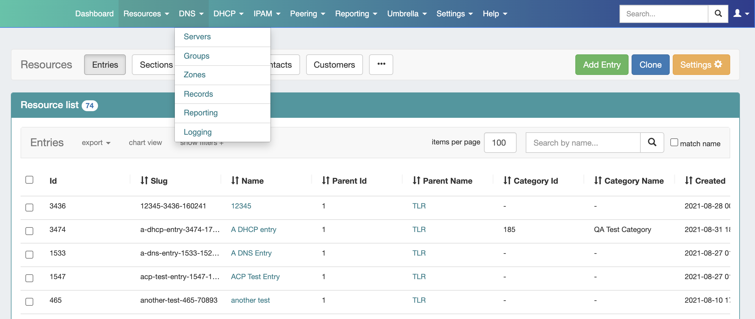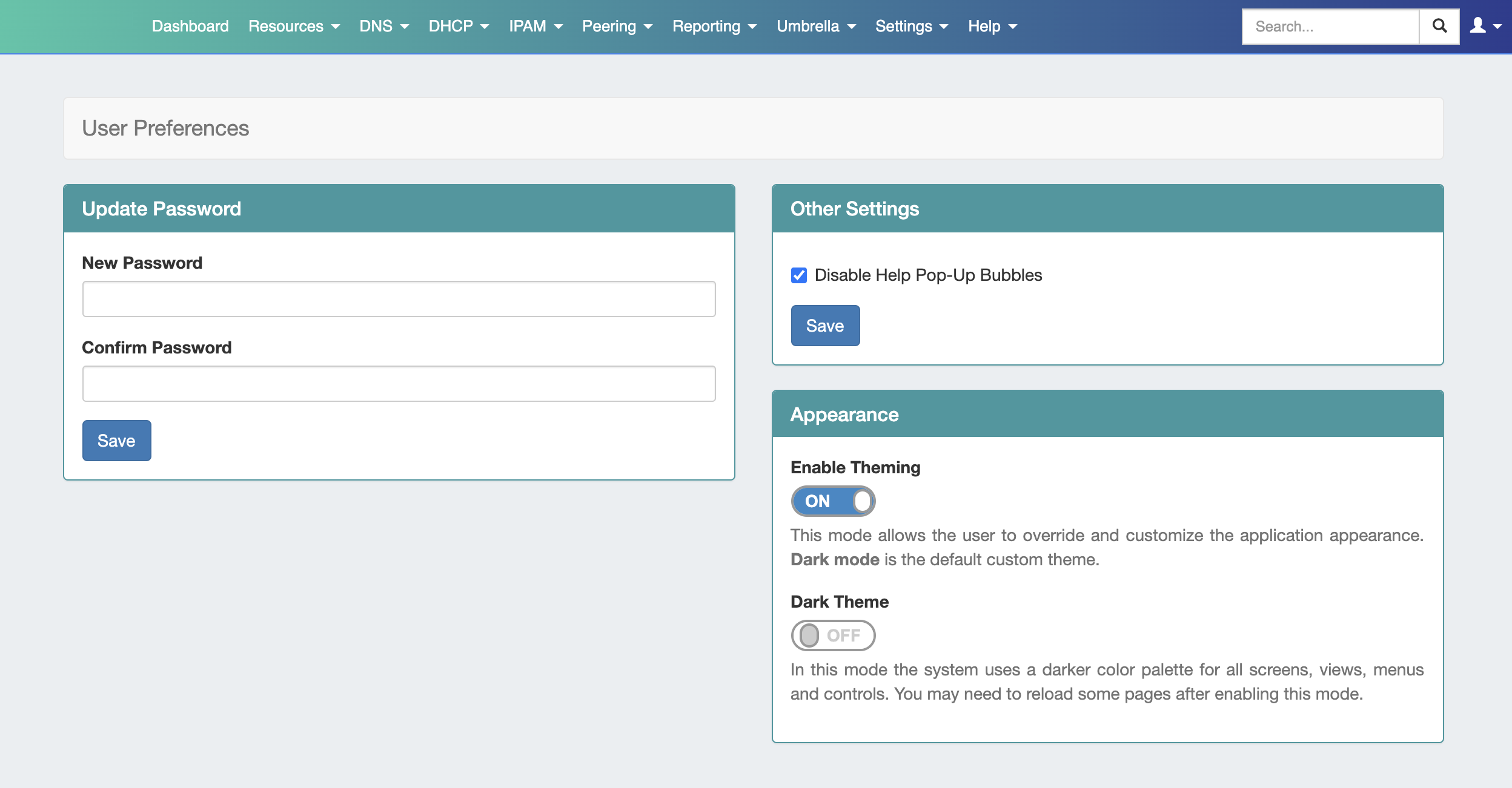 The updated navigation should be apparent, in this case with "DNS", "DHCP", "IPAM", "Peering", and "Reporting" tabs no longer visible.