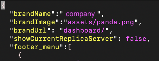 The top level of menu.json contains instance-wide settings for brandName (displayed company name), brandImage (logo), brandUrl (default page), and "showCurrentReplicaServer" (displays a small banner with the hostname of the server to which ProVision is currently connected).