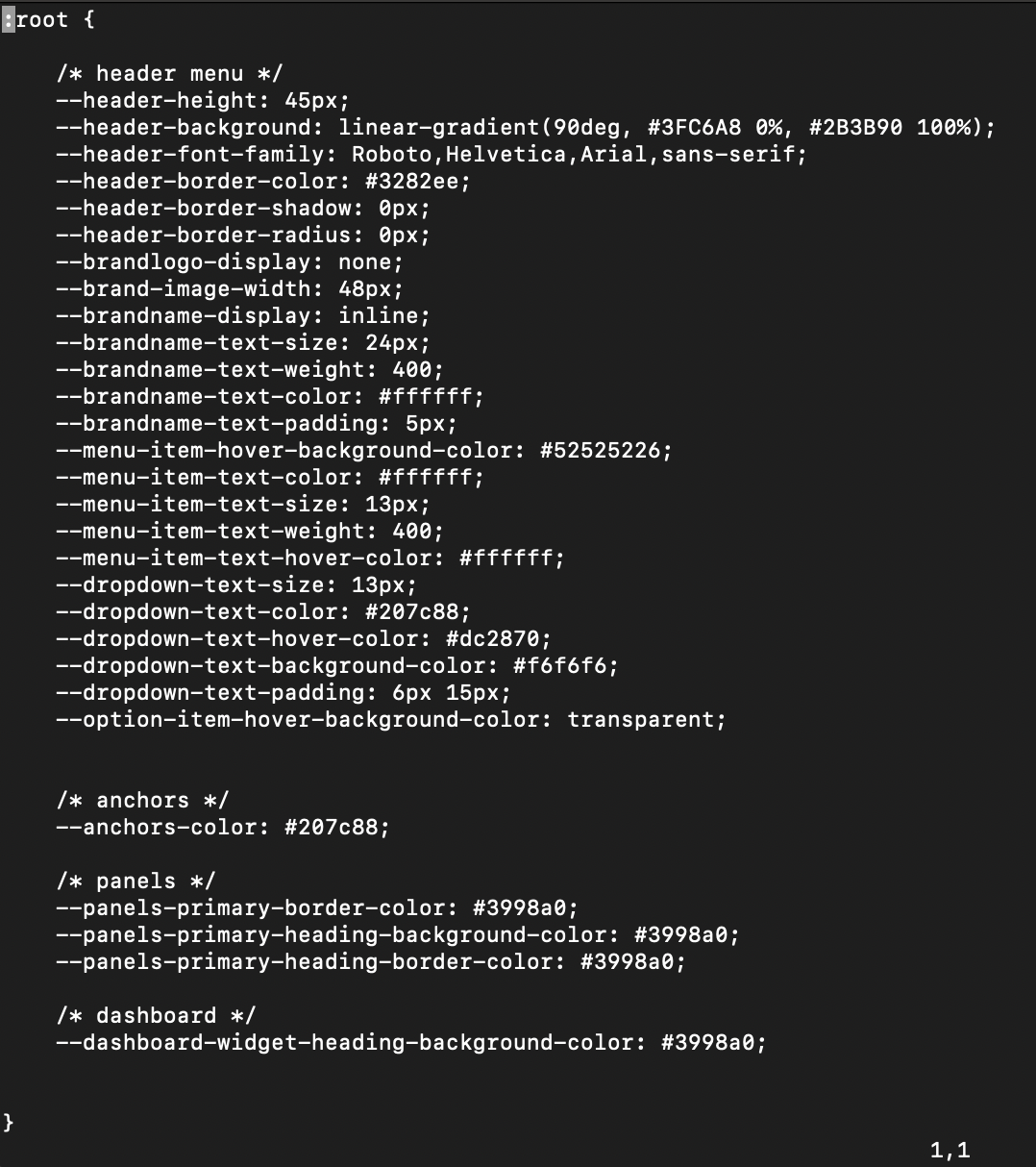 In this example, we'll create a simple teal theme using some of these variables, which focuses on color and font changes to the top navigation menu, panels, and dashboard: