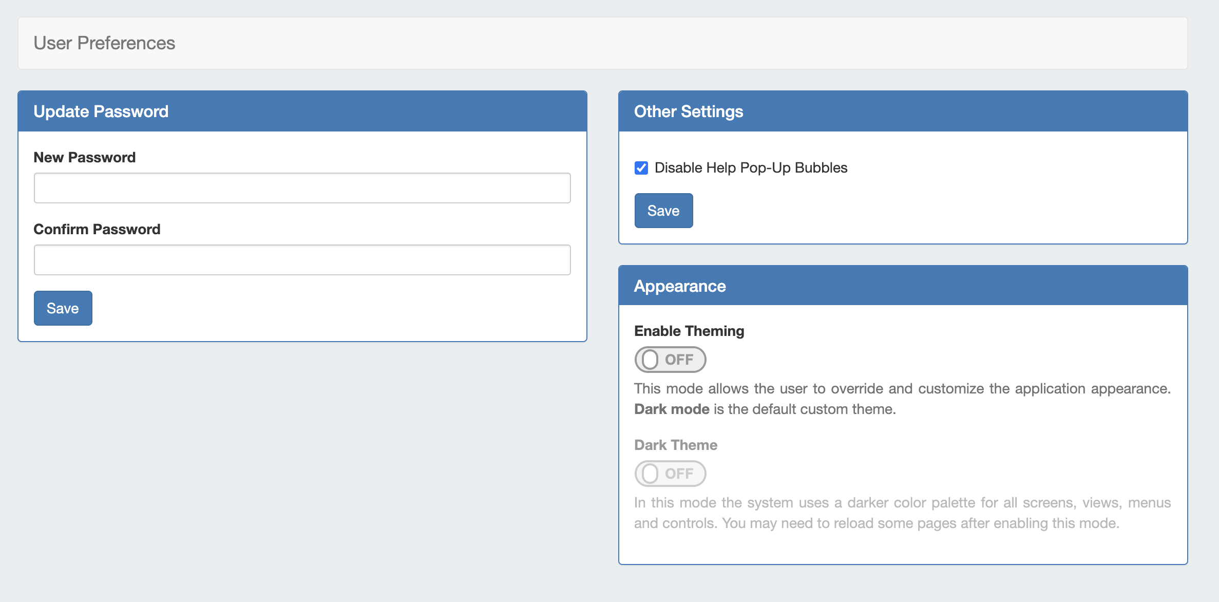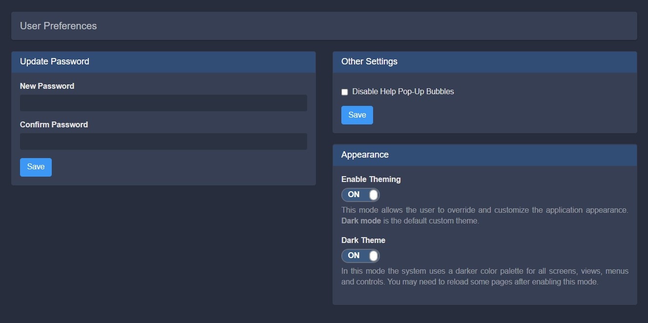 Users may select the desired theme by navigating to the User Preferences page and adjusting the Theming settings under "Appearance" as follows: