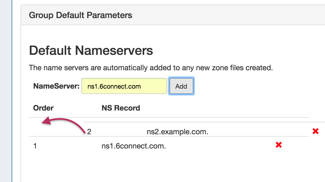 Change the order of multiple Nameservers by left-clicking (holding the mouse button down) over the NS record to move, dragging to its desired placement, then releasing the mouse button.