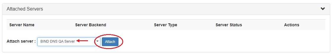 • Attached Servers List: Displays the Server Name, Server Backend, Server Type, Server Status, and available actions. Click on the Server Name link to view details