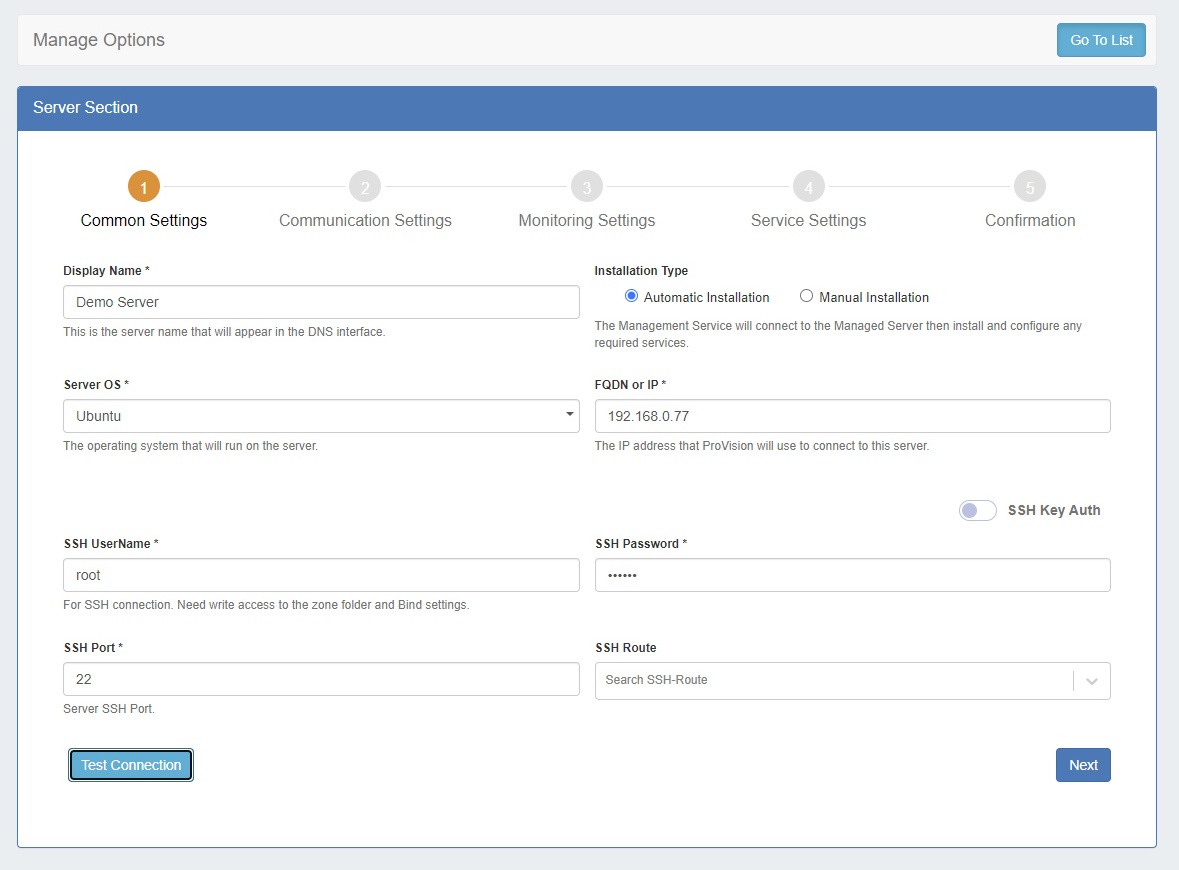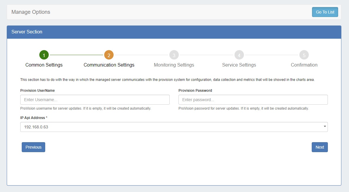Managed servers require a ProVision user account and API IP in order to communicate configuration, data, and monitoring information.