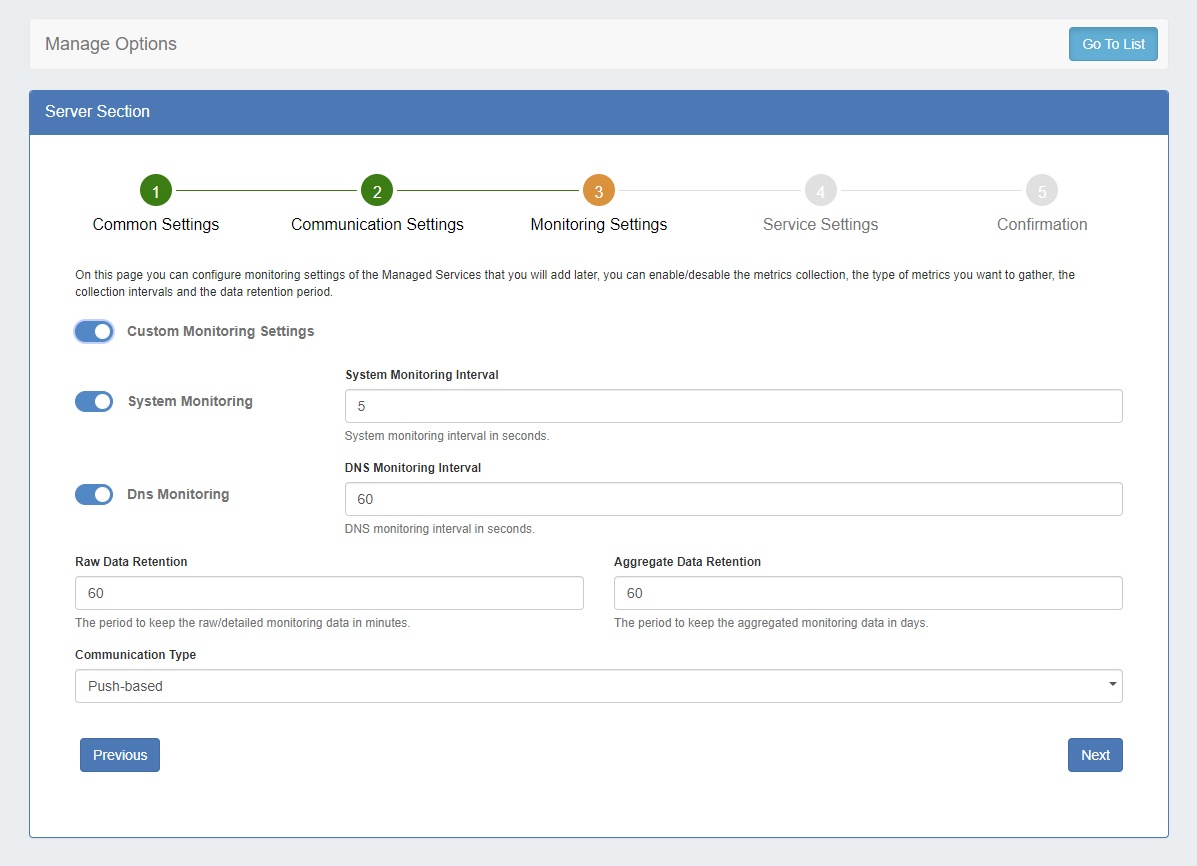 Select the desired monitoring settings for the server. You may either accept the default settings, or click on the toggle for Custom Monitoring Settings to override default settings.