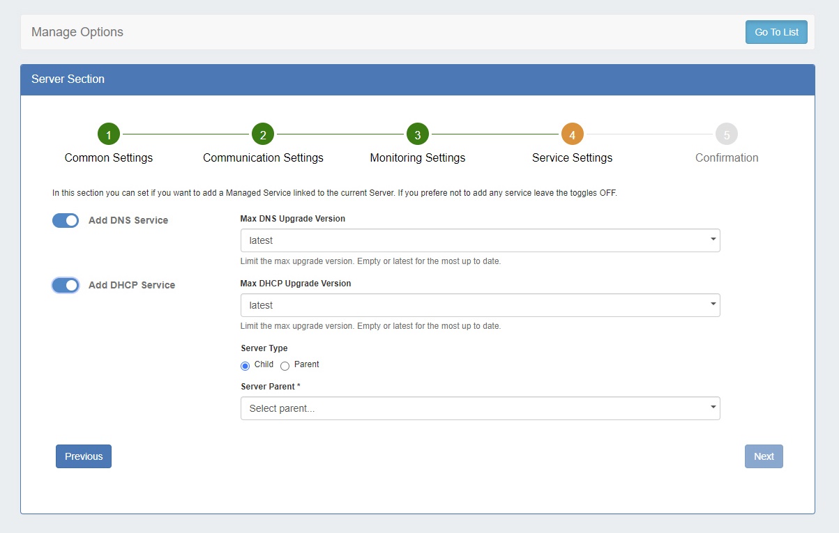 Child: If "Child" is selected, then the parent server must be selected. On the managed server there will be an attribute to note that it will have DHCP component, but it would be a child one and which one is the parent. In this case the pv_mysql component is not installed as it is not needed - the DHCP will connect to another database
