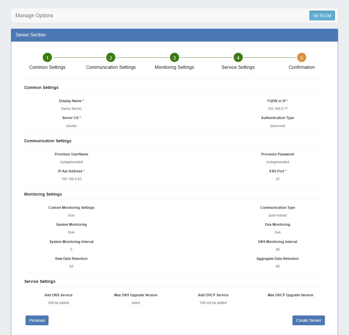 Once settings are verified, click "Create Server" to complete the setup wizard.