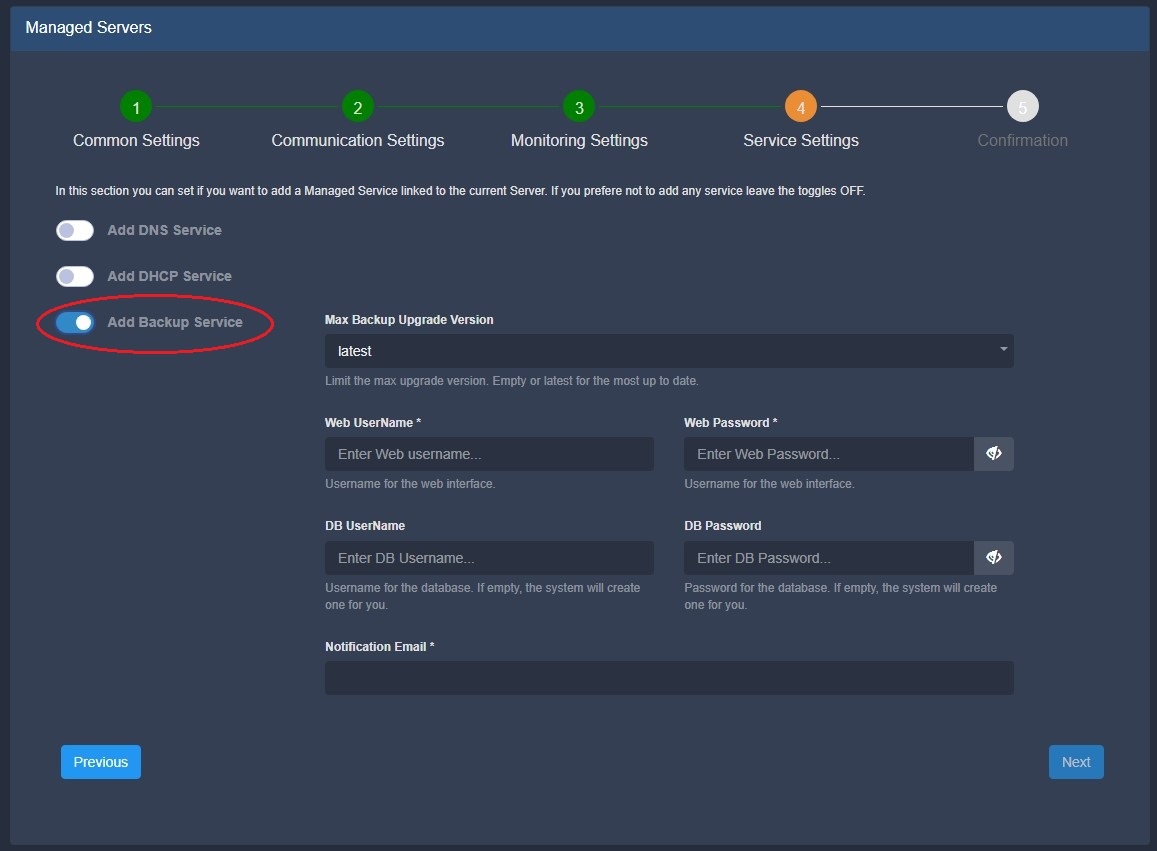 Add Backup Service: Enable / Disable to add a Backup Managed Service link. Options include: