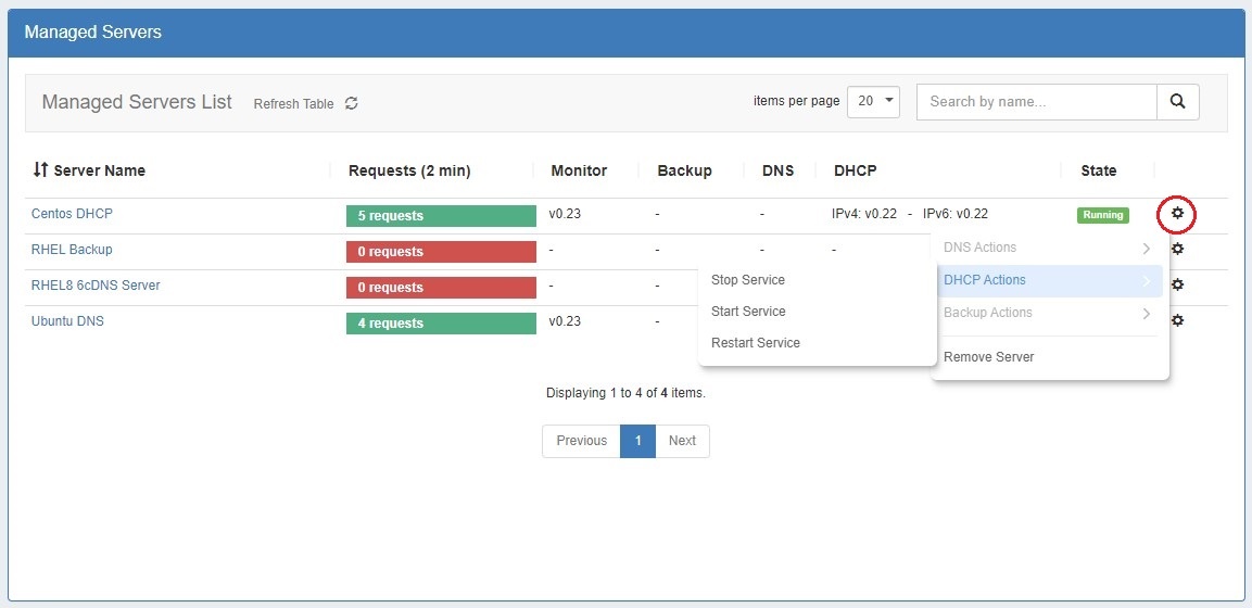Action Menu (gear icon): Right click on the action menu (or anywhere on the row) to display available server actions