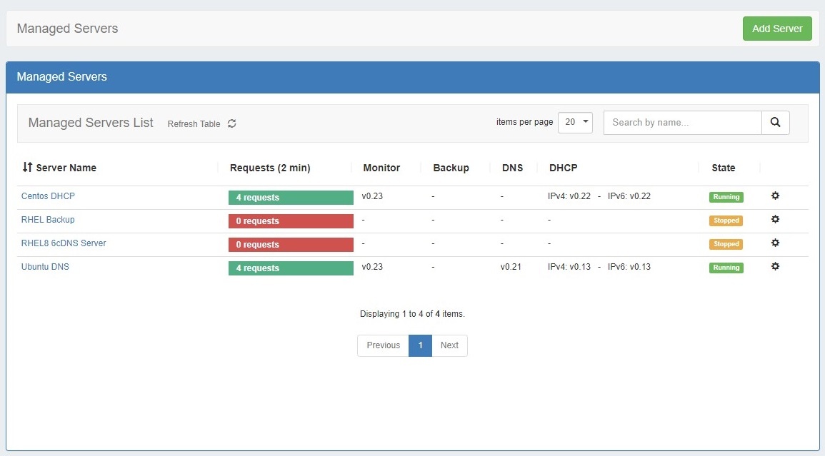 Display more/fewer servers per page by clicking on the "Items per page" selector at the top right of the list, next to the search box