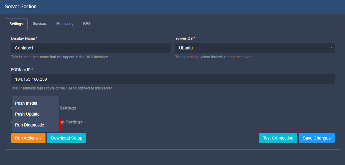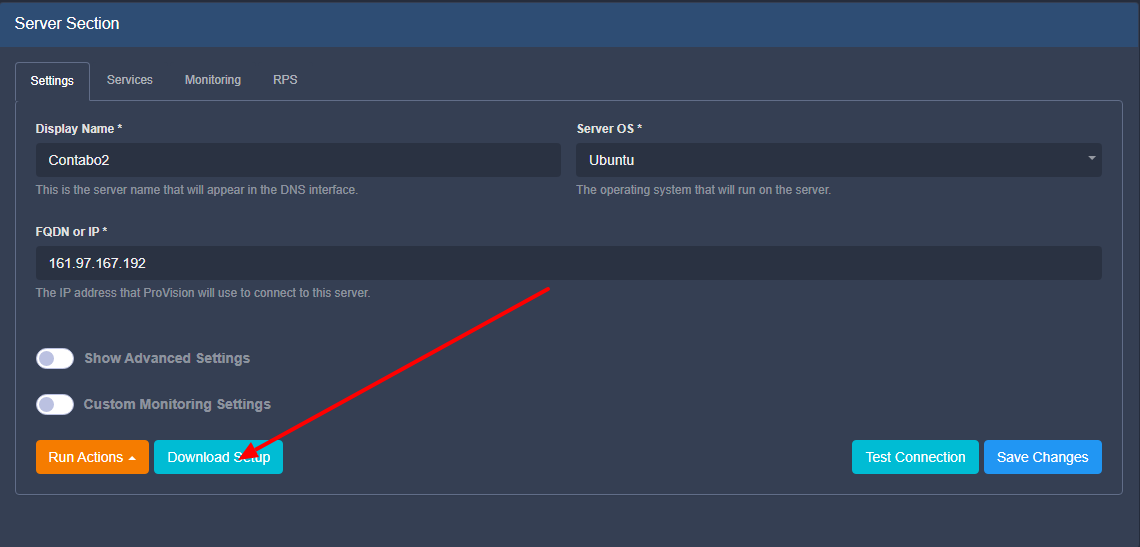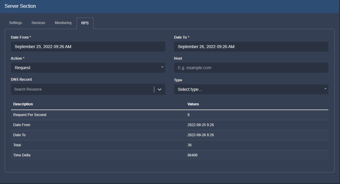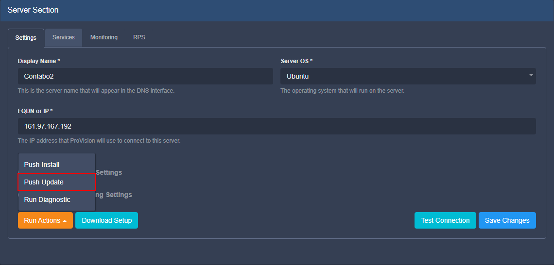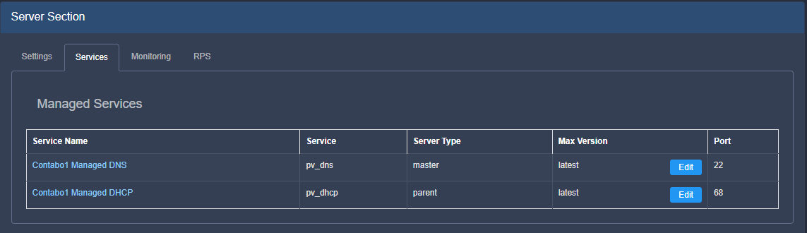 The details of a server are organized into tabs: Settings, Services, Monitoring, and RPS.