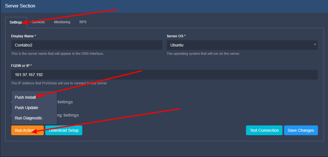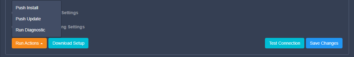 At the bottom left of the settings module, two buttons are available: "Run Actions" (including Push Install, Push Update, and Run Diagnostic options) and "Download Setup".