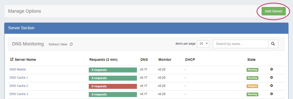 The Managed Server Section List provides server and monitoring data for each managed DNS / DHCP server.