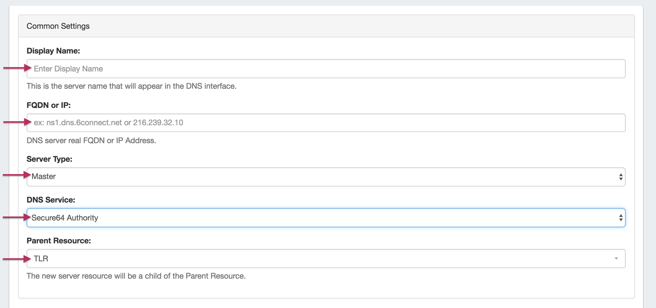 In the "Common Settings" section of Server Settings, enter the new server's Display Name (the name that will appear on the ProVision interface), the FQDN / IP, server type, DNS service type, and desired parent Resource (may be left at the default Top Level Resource). For Secure64 servers, ensure that DNS Service is set to "Secure64 Authority", "Secure64 x86 Authority", "Secure64 KNOT Authority", or "Secure64 Cache".