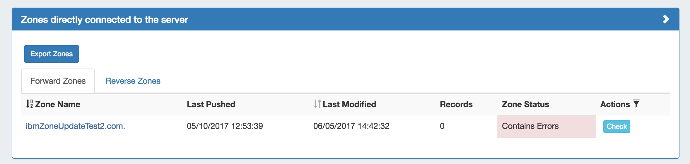 Zones directly connected to a server may be exported by Admin users from the DNS Server Details page, under the section "Zones connected directly to the server".