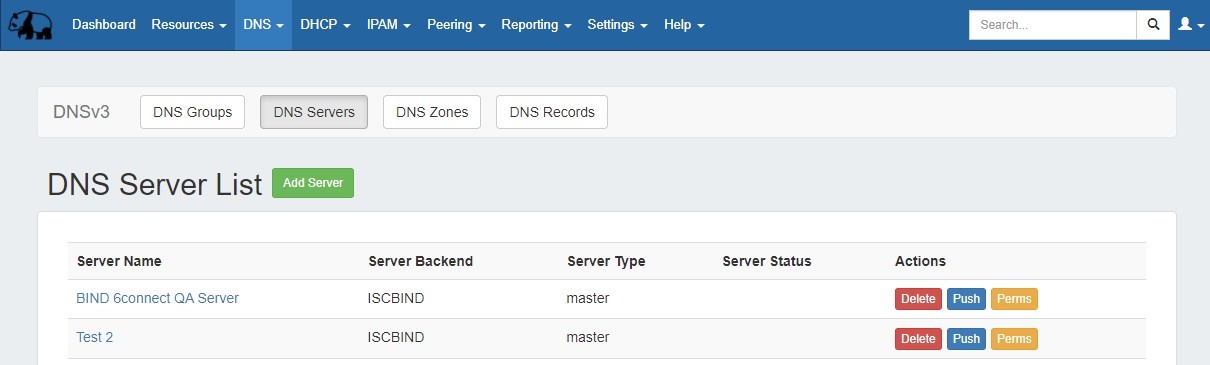 Users with resource "read" permissions may view DNS Server information, however only those with either Admin permissions or granted group-level server permissions can manage DNS server creation, edits, and deletion.