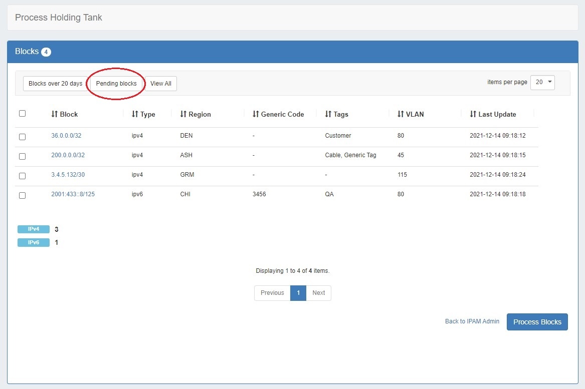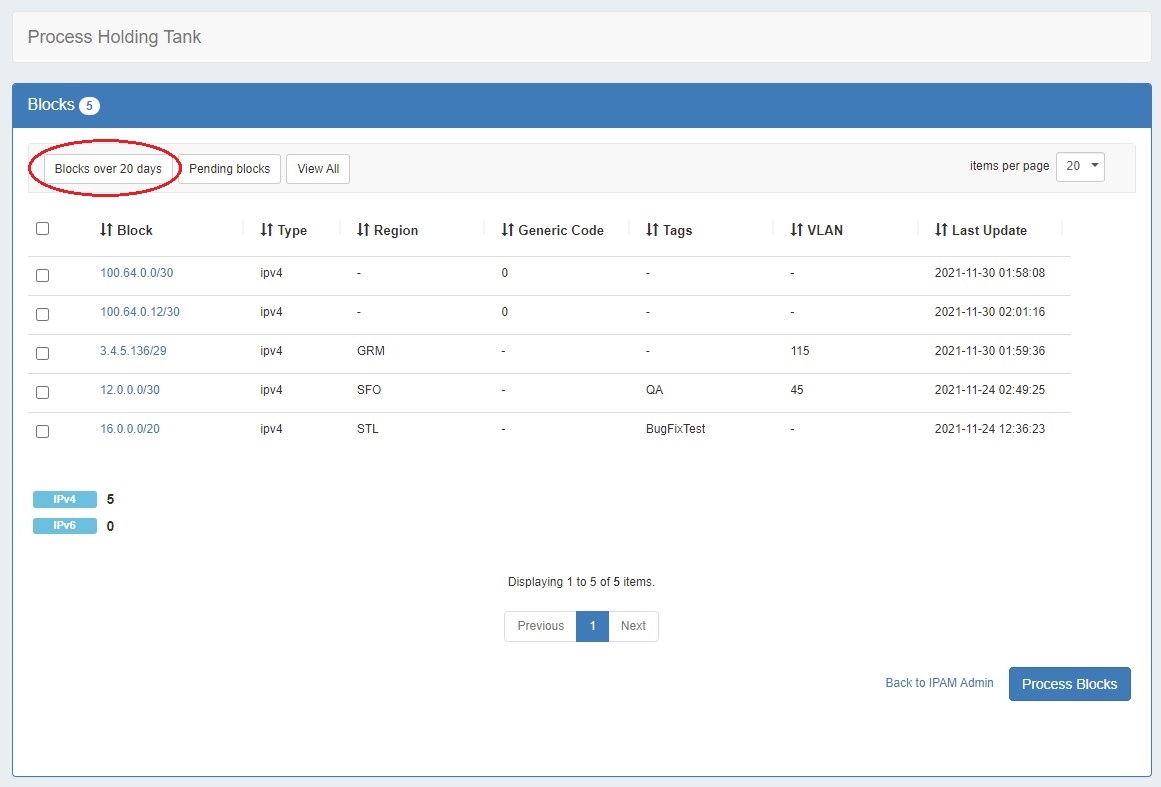 Then, at the top of the holding take, select the desired view from the top of the "Process Holding Tank" page in IPAM Admin. You may choose to view Blocks over X days, View Pending Blocks, or View All.