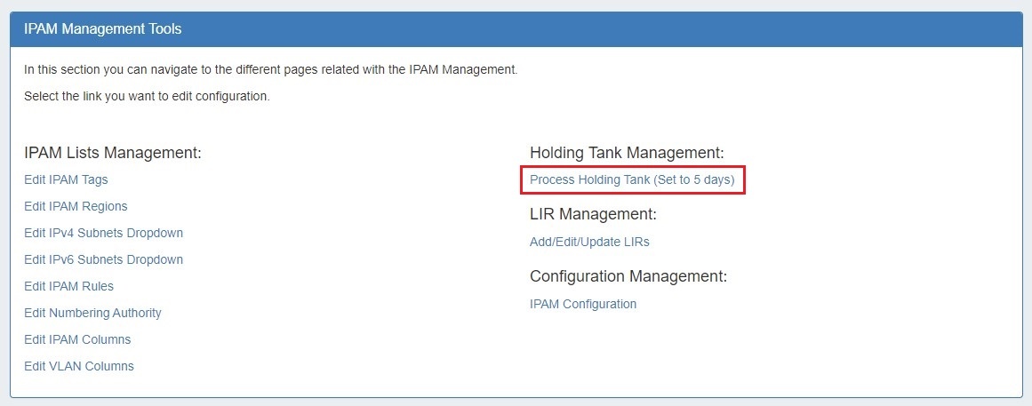 The Holding Tank, accessible from IPAM Admin → Process Holding Tank, displays a list of all unassigned IPAM blocks with the "Holding" status. Blocks older than the  IPAM Configuration → Holding Tank Days setting may be processed to be returned to the "Available" status.