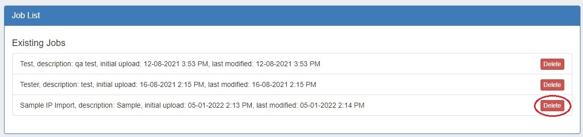 If the IP Import was fully successful, and you do not wish to retain the job data, the Import Job may be deleted from the "Existing Jobs" list by clicking the delete button next to the job name.