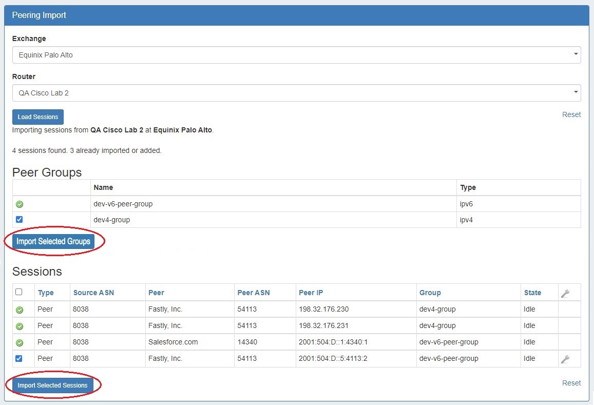 Importing peering sessions requires Admin-level permissions, and is accessible only from the Admin section of ProVision.