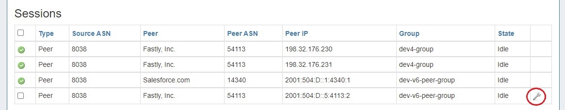 Once imported, you can manage and configure your sessions from the Peering Tab.