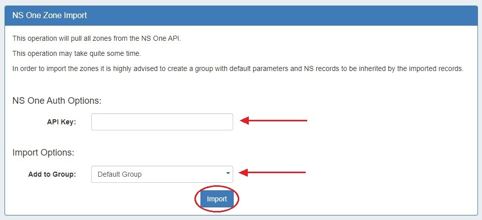 Then, enter the NS One API key and the ProVision DNS Group to add the zones to.
