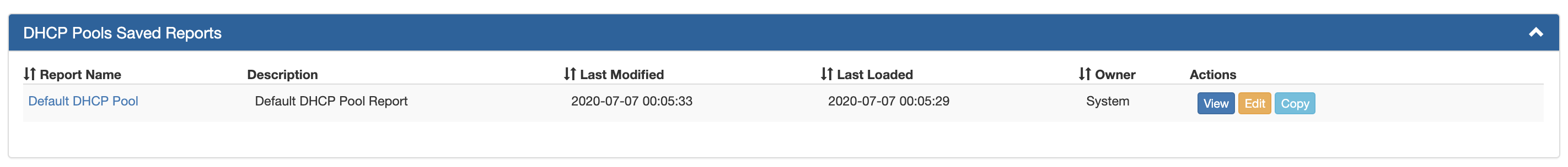 - Default DHCP Pool Report: ProVision DHCP Pools for the default server(s), both subnet and hosts, with no additional filters applied.