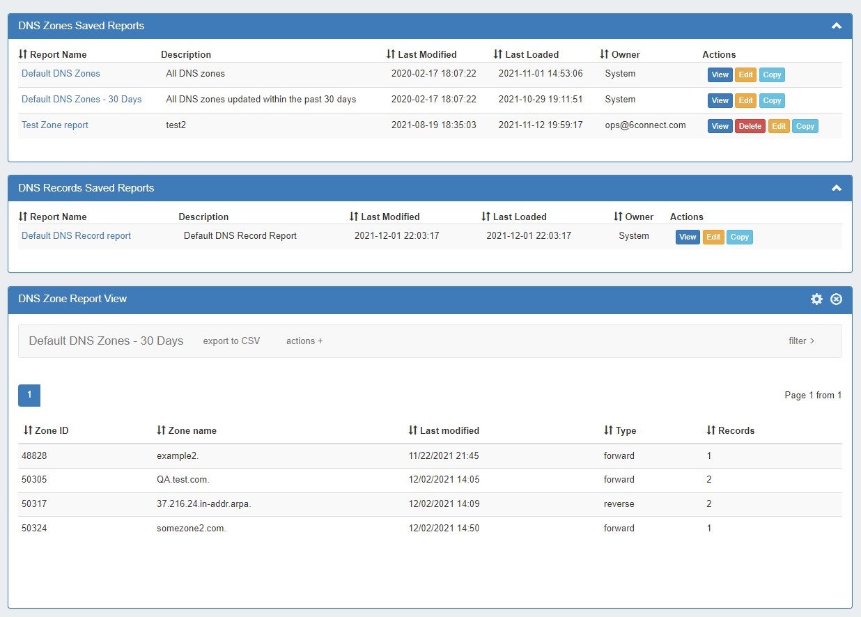 DNS Zone reports provide a list of zones existing in ProVision, along with the fields of Zone ID, Name, Last Modified Date, Forward/Reverse Type, and Record Count information. DNS Zone Reports may be exported to .csv (limit: 100,000 records). Default reports include: