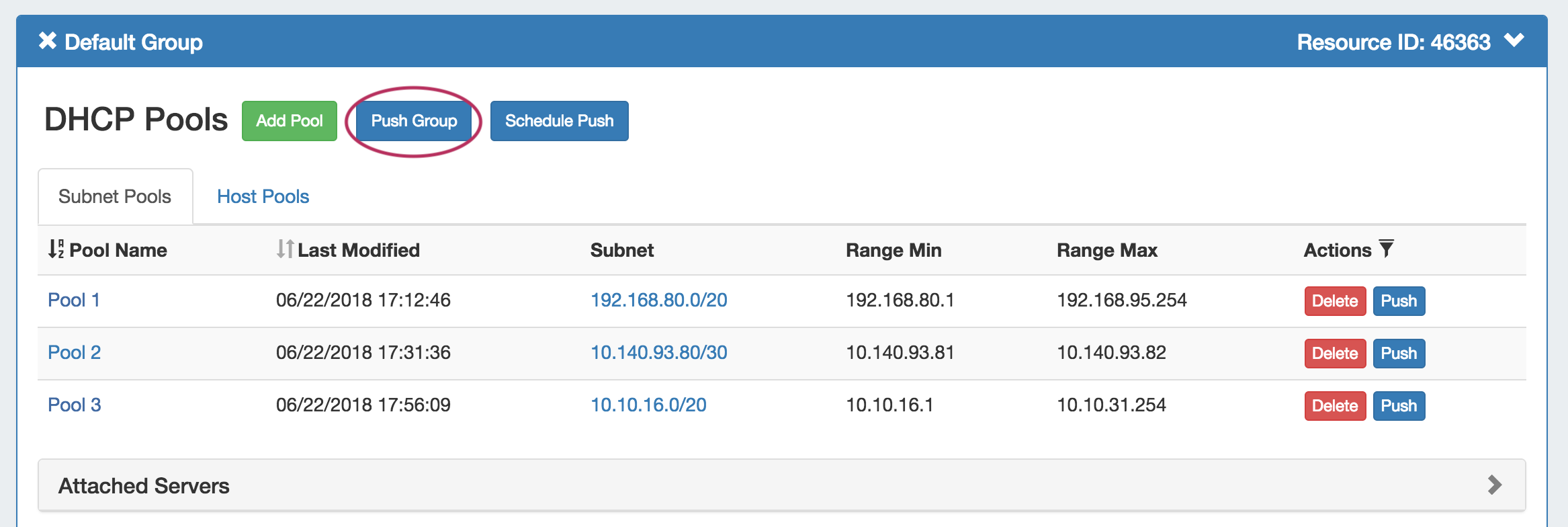 After verifying the attached server, manually push the group by clicking the "Push Group" button under the desired DHCP group.