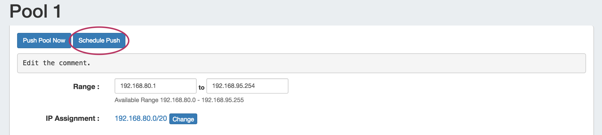 To change the current IP assignment for the pool, click the "Change" button next to "IP Assignment".