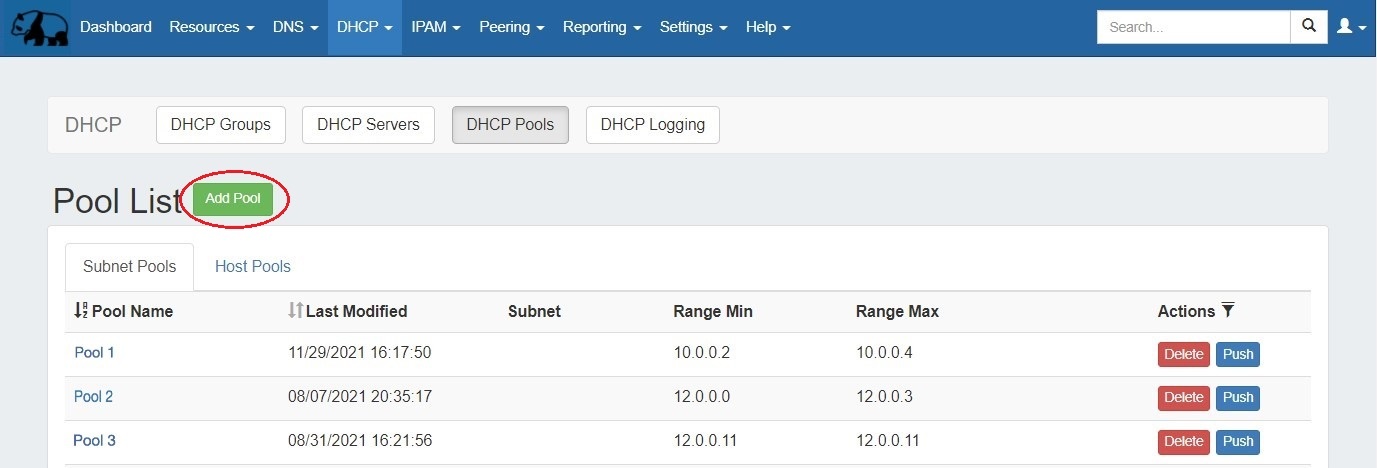 Pools may be manually pushed by clicking the "Push" button for the pool from any DHCP Pools list.