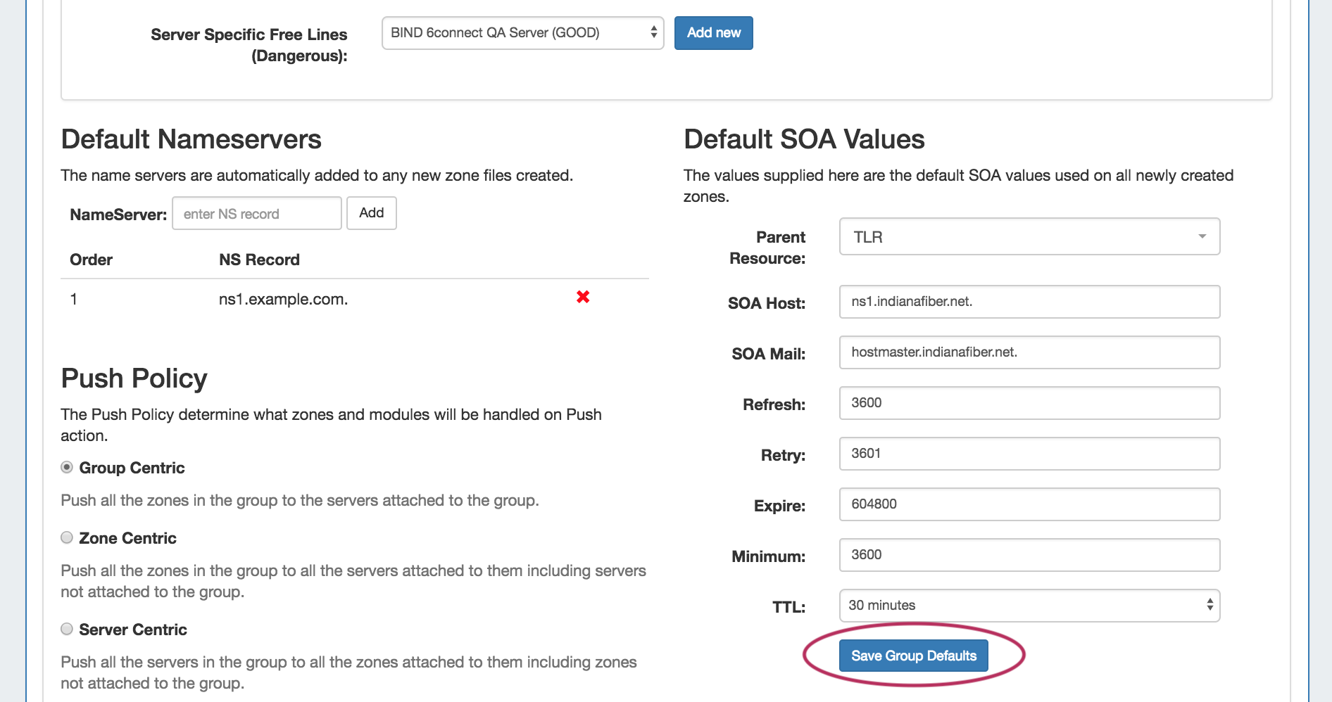 - Under "Group Default Parameters" verify SOA Settings, Nameservers, and the Push Policy are set.