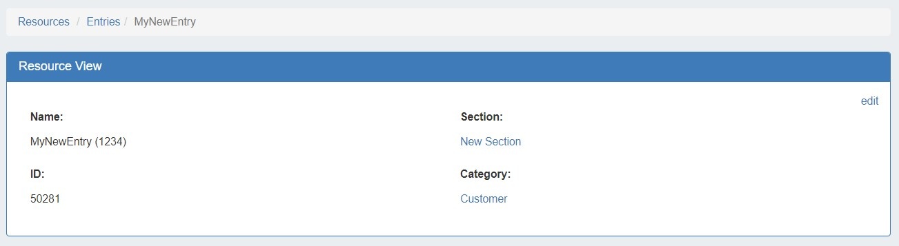 Open the page by clicking on a resource name from the Resource List, or select "View" from the Action Menu for the resource in the Entry List.