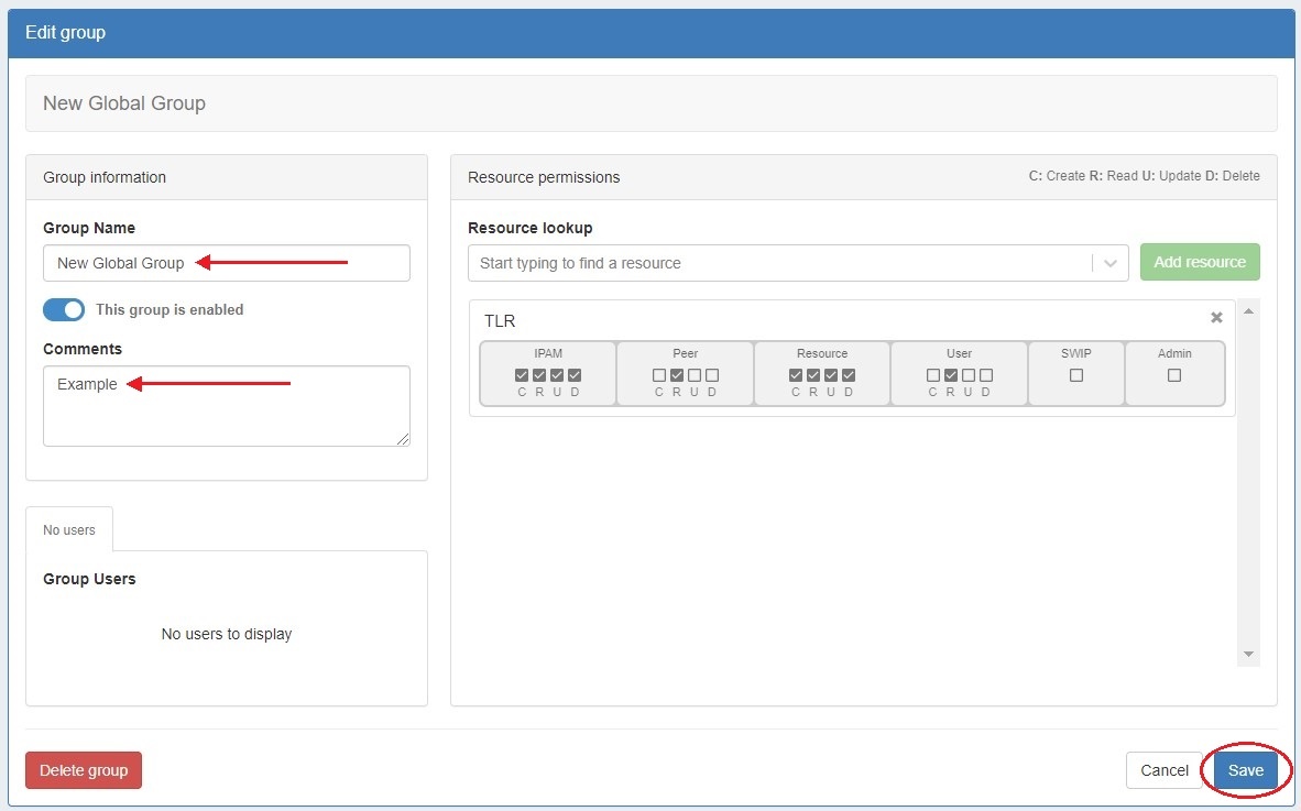In the example above, the group “MyGroup” allows the users Bob Smith and Jane Doe to only read IPAM and DNS data for the Resource “Awesome Co”.