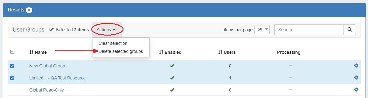 Select the "items per page" filter to limit the number of groups displayed at one time. Any additional users will be displayed on following pages.