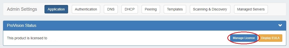From the Admin Settings page, ensure the "Application" sub-tab is selected, then click "Manage License".