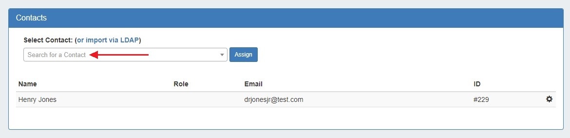 You can also import and assign a contact via LDAP from the Contacts Gadget. Click on "import via LDAP" and a separate search box will appear. Search for an LDAP contact and hit "Assign".