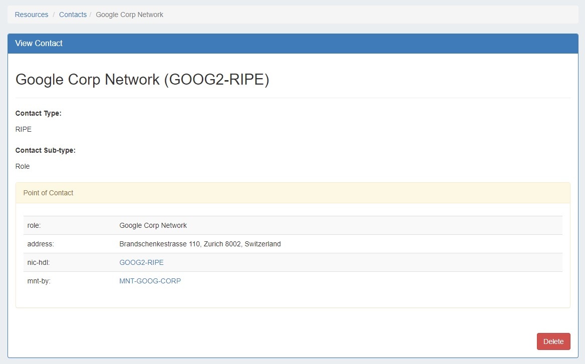 To import a contact from ARIN or RIPE, click the "Import from RIR" button from the contacts page.