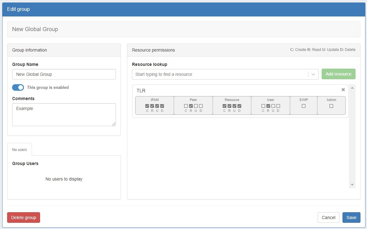 Group details are the same for Global groups as for non-global groups, excepting that the resource selected is TLR (Top Level Resource). You may choose to edit the name, enable/disable the group, show or hide C/R/U/D permission details, and view users assigned to that group. Be sure to save any changes after editing.