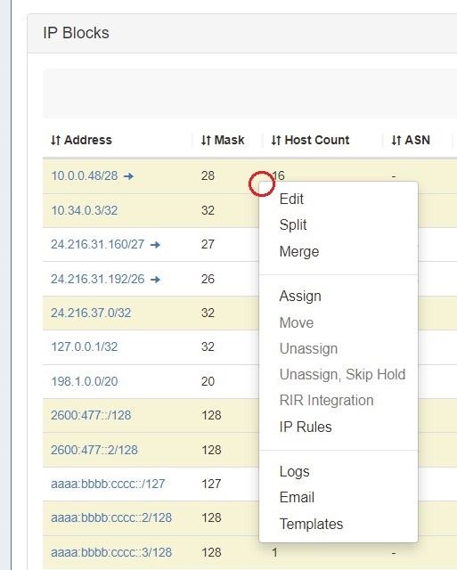 For more information on assigning and managing blocks, see Working with IP Blocks - Assigning IP Space.