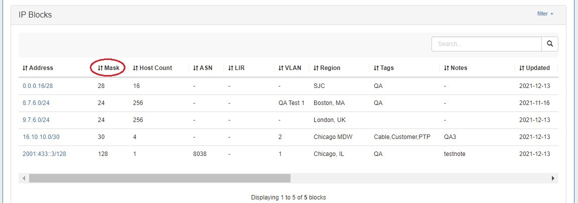 View, search, filter, and sort Assigned Blocks for the resource via the "IP Blocks" list: