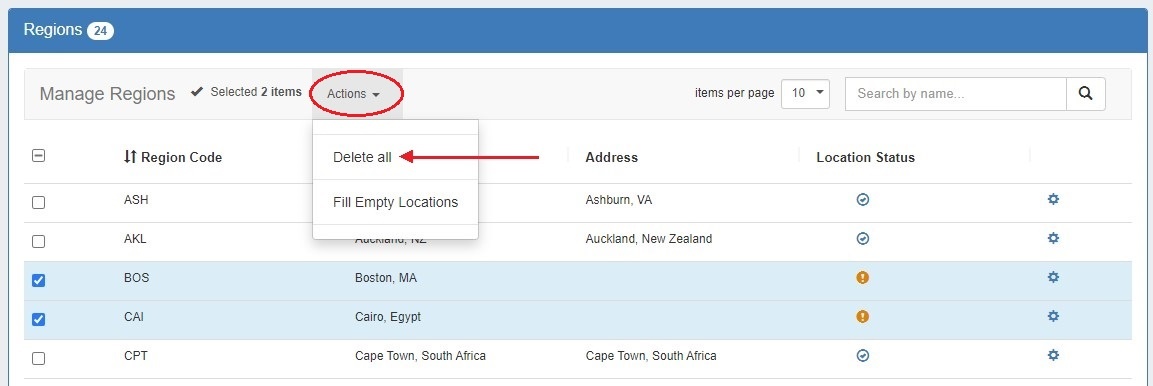 To delete multiple regions, select the regions to delete by clicking the checkboxes at left. Then, click on the "Actions" menu at the top of the list and select "Delete All".