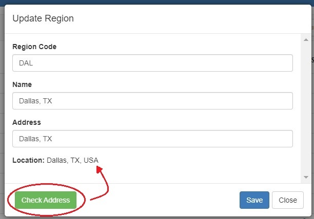 Valid addresses will show a check mark in the "Location Status" field, invalid/empty addresses (unable to be mapped) will show a yellow exclamation point. When adding or editing a region, click the "Check Address" button at the lower left of the modal to check the validity of an address.
